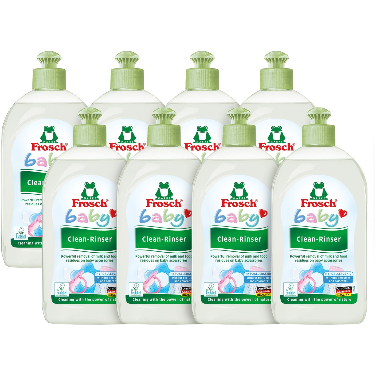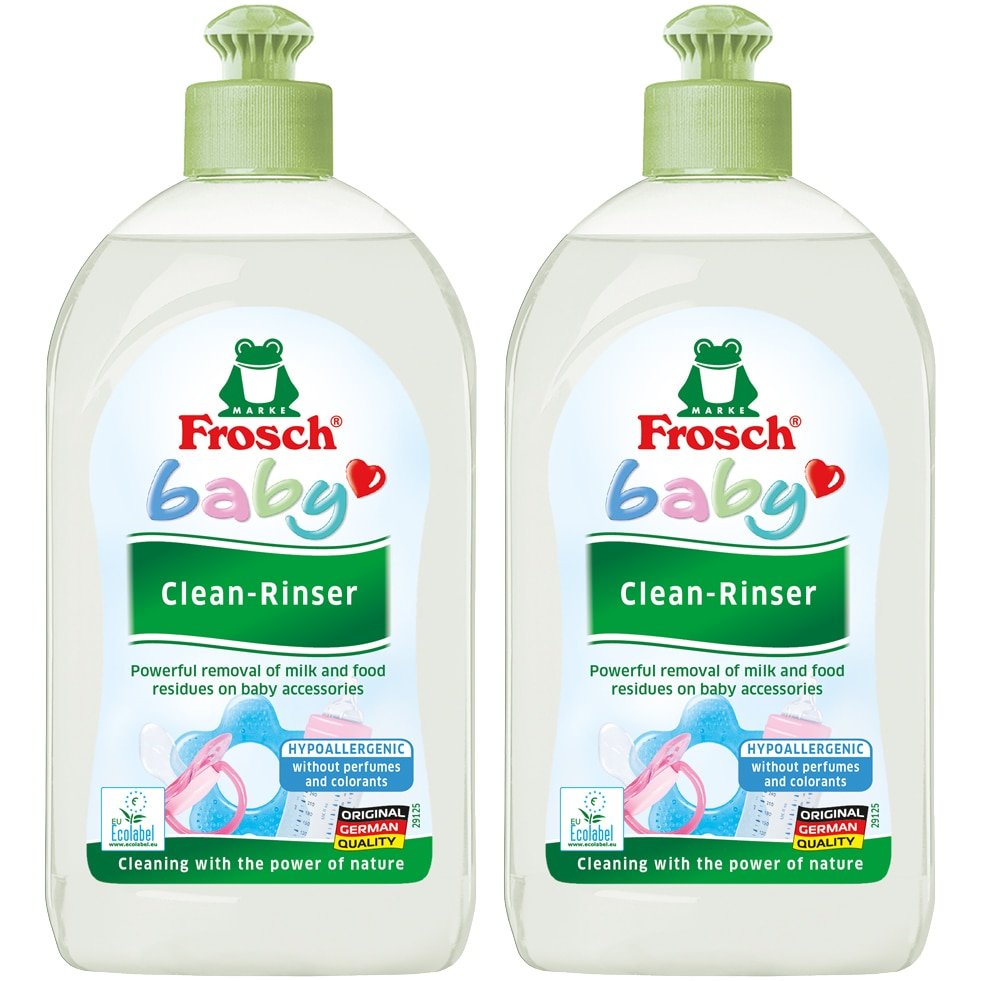 A Frosch Eco babáknak készült mosogatószer eltávolítja a tejet, a gabonaféléket és más ételmaradékokat, és kíméletesen tisztítja a babaápolási tárgyakat, mint például a cumisüvegeket, cumikat, rágókákat és mosható játékokat. Mivel a folyadék maradék nélkül kiöblíthető, teljes mértékben biztonságos a babák számára. A provitamin B5-öt tartalmazó hipoallergén formula nem használ illatanyagokat vagy színezékeket, és megvédi a bőrt a kiszáradástól. Az 5,5 pH-értékű, bőrsemleges formula kiváló bőrtoleranciáját dermatológiailag megerősítették. Ezáltal a Frosch baba mosogatószer ideális választás allergiában szenvedők számára.
